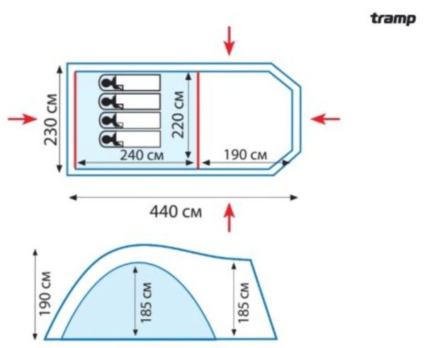 - – Двошарова кемпінгова палатка з чотирма входами, великим фойє.
