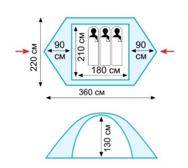 Намет з двома входами та двома тамбурами збільшеного обсягу та площі. Додаткова консольна дуга збільшує площу та внутрішній об’єм тамбуру, підвищує вітростійкість та вітрообтічність намету.